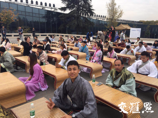 11月11日下午2点,大报恩寺琉璃宝塔下,一群身着宽衣大袍、两袖飘飘的“歪果仁”端坐在国学桌前,引发围观。