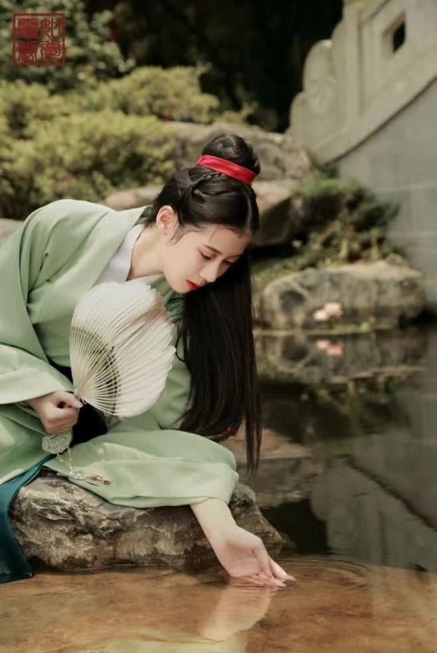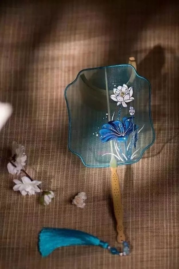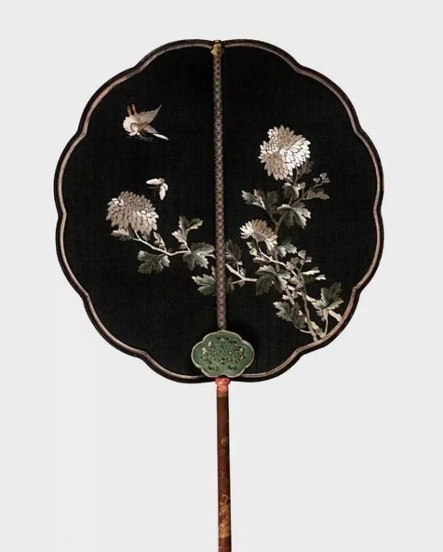 扇面上常绣以山水花卉,款式争奇斗艳,闺阁仕女手摇团扇,清风徐来,不但可以平添主人娴雅文静的仪态,又能体现女性天真活泼的个性。