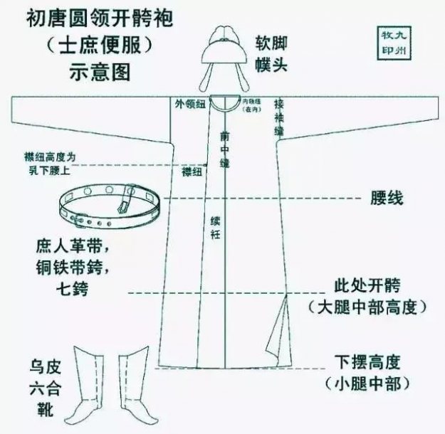 唐朝,圆领袍发展出了两类,一类是开骻,即两侧开叉。一类是闭骻,在下摆处横加一条,以显示追寻祖制。而在脖子处两侧有布扣,两边胸侧乳下有布扣,总共4处布扣。腰穿蹀躞带,头带幞头,下穿中裤以及靴子,内穿圆领中衣,这样就是一套标准的圆领袍全套。圆领袍的领型分为四种,无领,微立领,宽领,立领。