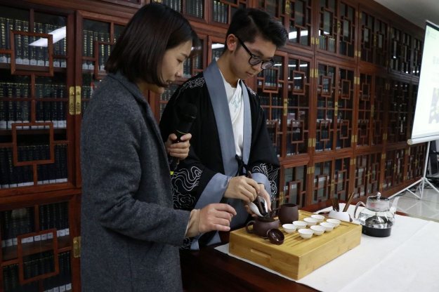 广东东软学院印尼学生William为大家表演茶艺。