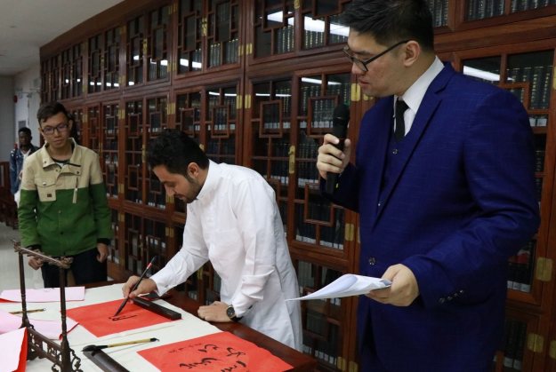 来自也门的广东东软学院学生阿俊现场展示书法。