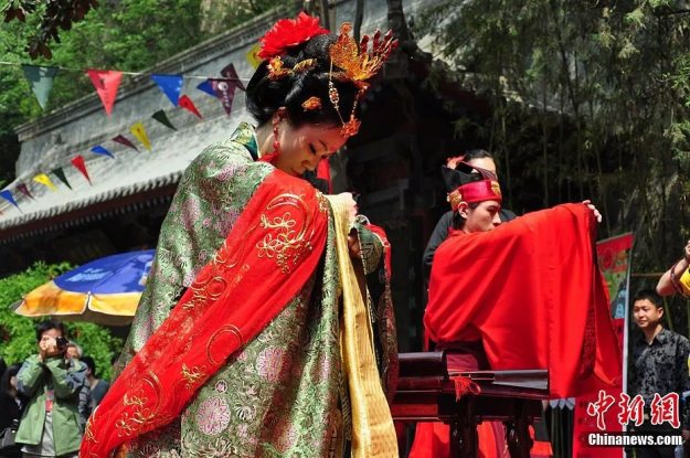 随后,新人行解缨结发礼,新郎新娘相互剪下一缕头发,新娘用红线将头发扎在一起,表示永结同心。新人为对方佩戴玉佩,而后行执手礼。最后行三拜之礼,一拜天地,二拜高堂,夫妻对拜,礼成。