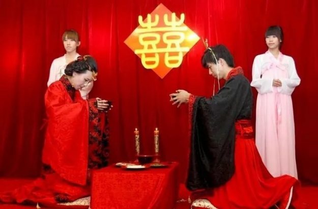 赞者读诰文,随后新人行沃盥礼,洗双手,表达郑重之情。