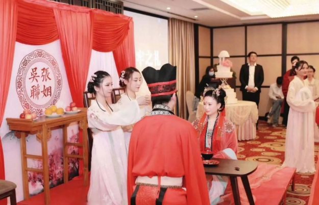 正婚礼:亲迎、沃盥、同牢、合卺、解缨结发……固定的礼法需要专业仪程编排,在编排中注入每一对新人的情感,使之饱满灵动,凸显真挚爱情的甜蜜。