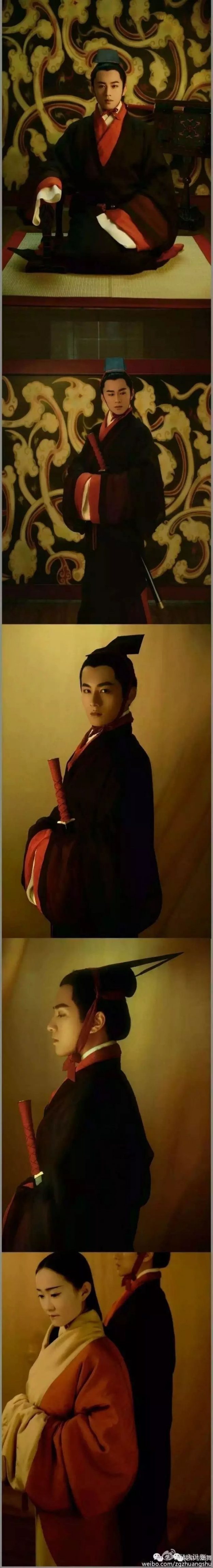 《易·系辞下》:“黄帝、尧、舜垂衣裳而天下治,盖取之乾坤。”明确记载衣裳形制,也就是上衣下裳。黄帝时期相当于仰韶文化阶段,距今已有五千多年。衣裳制后来发展成冕服,根据金文释读,冕服制度形成于公元前十一世纪的西周时期。大盂鼎、毛公鼎、吴彝、颂敦等青铜彝器都有赐服的记载,这时冕服已成为法服(礼服)。颜色方面要求上下协调,选用五种正色为佳:青、赤、黄、白、黑,总之应选用深色调,不能用翠、嫩、浅、花一类浅色。上苍下黄、上黑下红是经典组合,也是传统礼服的一贯配色方案。