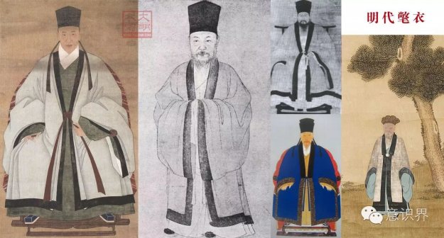 【氅衣】又称鹤氅,晋代已有记载,多为道家所用,宋代文人好服鹤氅,明代士人多作为便服外套使用,天冷时也穿以遮风御寒(与披风一样内衬毛皮)。形制与披风相似,对襟,直领,大袖,衣襟用长带一对系结,衣身多为浅色,领袖衣襟均施有深色缘边,两侧一般不开衩(也有做成开衩的)。因为氅衣、披风外形接近,故有时两者也互相混称(如一些小说中同件衣服可能既被叫做披风又被叫做氅衣)。