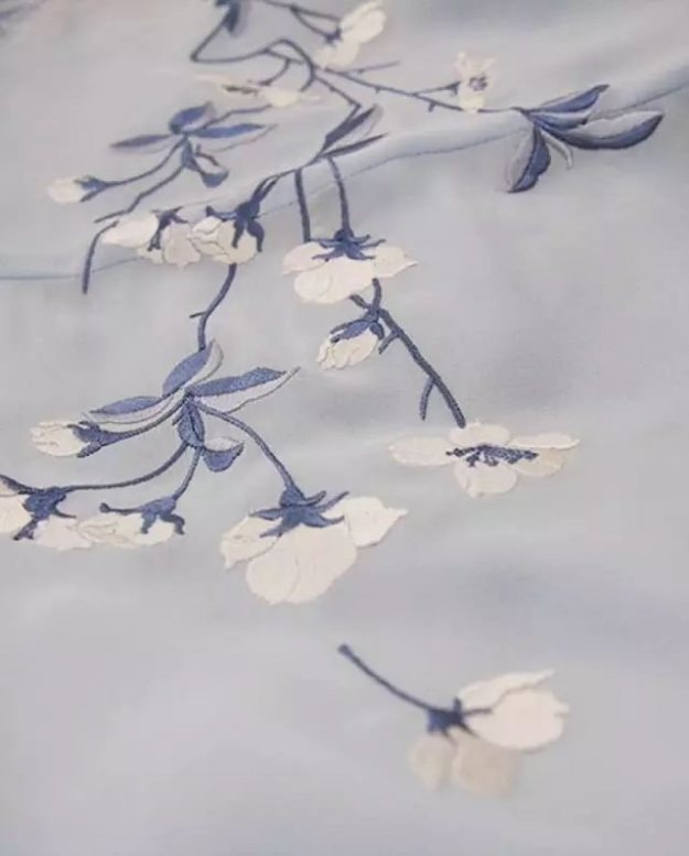 布料扎染、图样刺绣,无不需要工匠们精湛的技术,在一线一针当中匠心独运。交领右衽、褒衣广袖、系带隐扣是汉服结构的重要特征。