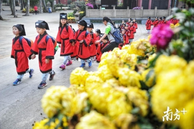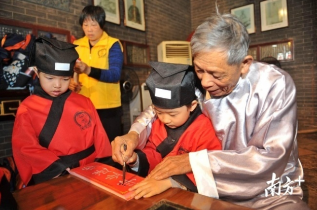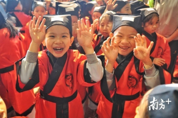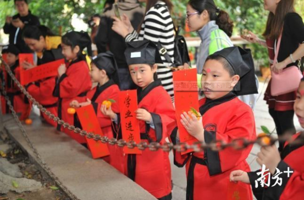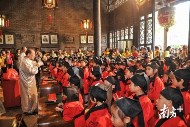 “小朋友,你们知道•孝’是什么意思吗?•孝’字上面是个•老’字头,下面是个•子’,讲的是大人与小孩的关系。”阳春三月,佛山市祖庙博物馆在孔圣殿内举行开笔礼,100多名即将踏入小学门槛的萌娃们身穿整齐的汉服,在启蒙老师的引领下参拜孔子像、聆听教诲、开笔描红、抱文笔、点朱砂、参拜文魁阁、敲响启智钟,好不热闹。