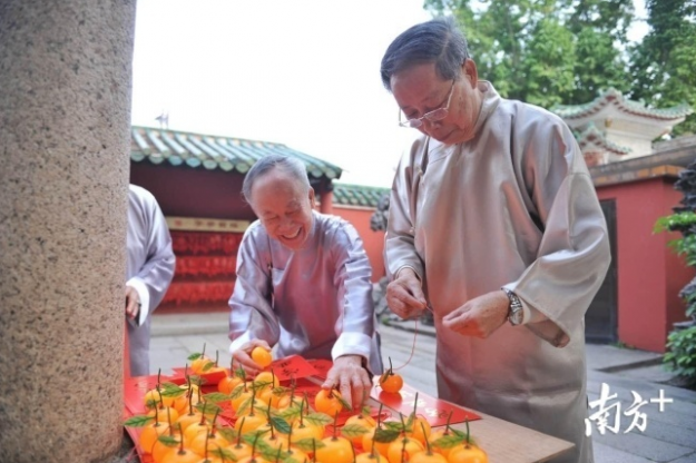 参拜完成后,学童们依次敲响三元亭旁的启智钟,并将拴好金桔的吉祥条幅挂在许愿树上,许下学业有成的美好心愿。