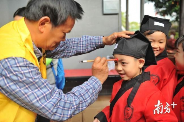 之后是朱砂开智环节。启蒙老师用朱砂在学童额头正中点上红痣,又称开天眼,寓意“孩子从此眼明心明,好读书,读好书”。