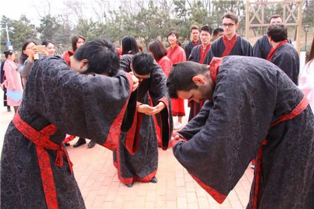 不得不说,汉服把古典、含蓄、轻盈、飘逸之美体现的淋漓尽致,活动伊始,居民们身着汉服,富有韵律地吟诵着诗歌,为大家奉上了一场精彩的诗文盛宴。当天的活动除了居民参与,还吸引了不少外国面孔——来自青岛大学国际教育学院的20多名留学生也来到了现场,共同学习中国古代礼仪、体验传统中国清明民俗。“这是我第一次参加这样的活动,感觉很有趣,中国的文化很丰富。”来自日本的饭沼洋子兴奋道。