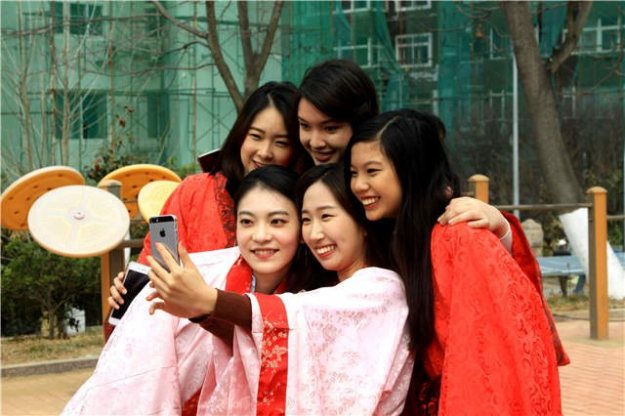 “春之风自下而上,纸鸢因之而起”,在古代,放风筝不但是一种游艺活动,更是为了祈求放走晦气,消灾解难。留学生们认真在纸鸢上涂画着,希望风筝可以带走所有的秽气,带来好运。画好了风筝,穿上汉服,十几位外国姑娘也当了一次“汉人”,将寄寓美好祝福的“纸鸢”放飞空中。