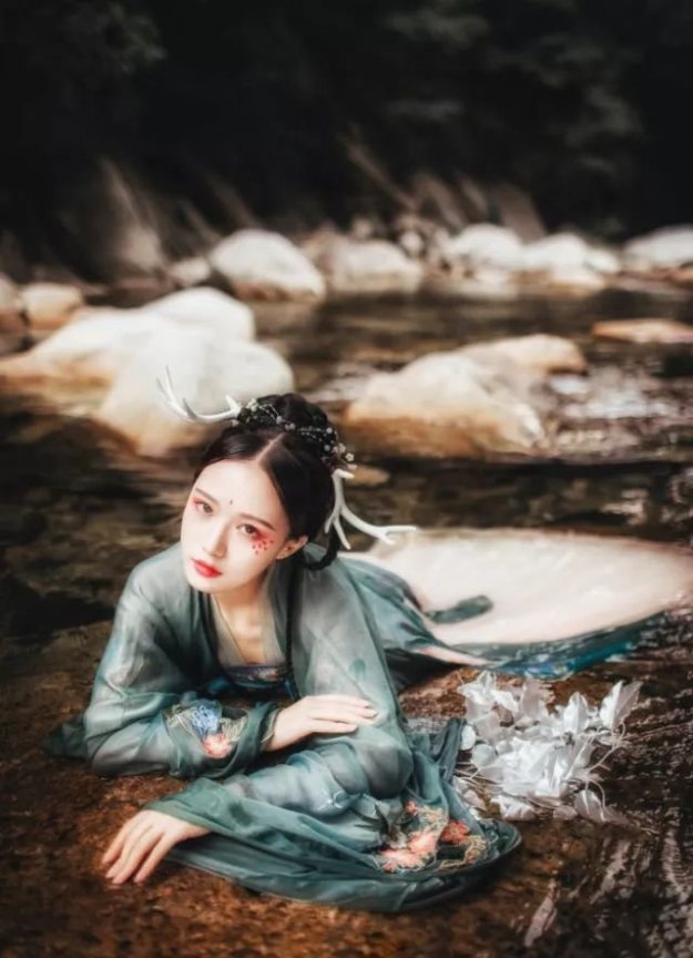 “交领右衽”,衣服前襟左右相交,形成整体服装向右倾斜的效果。