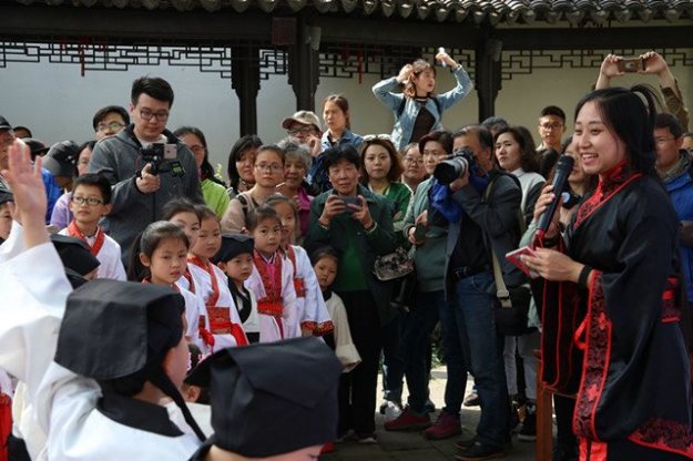 昨天下午,参与活动的40多名少年儿童陆续来到甘熙宅第津逮楼前,他们换上汉服后显得很兴奋,由于现场有绿树、红枫、假山、水池、亭台等美景,家长们忙不迭的用相机、手机为孩子们拍照。扬子晚报现场活动的直播美女严文倩也是一袭汉服,在她跟同学们打过招呼后,活动正式开始。