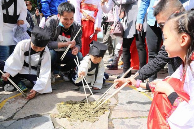 “投壶”时家长可与孩子家长配合,以便让孩子在离壶最近的距离将箭投向壶中,有的人竟将箭投入孔隙更小的壶耳中,要求“加分”;最后一个环节是“抽签背古诗”,参与者亲自摇签,签上写有小学必背古诗,摇到后必须背出,家长可以提示,但不允许用手机上网查。