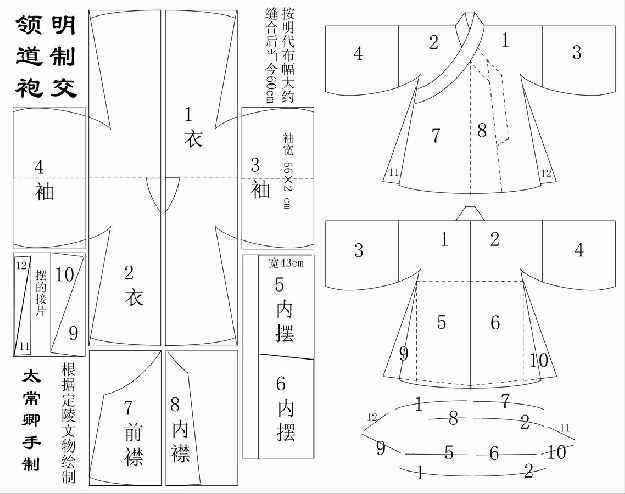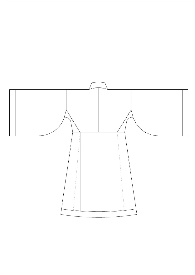 特徵是通裁而成,所以腰间没有缝线,当然从唐代马周定袍制起就有意回溯深衣的内涵,所以直身袍往往在膝盖处有缝线,但腰间是绝对没有的。这类又称为直裰、道袍,按照宋明的术语,又划归衫和袍,并呈现不同的形态特征(这些以后再讲)。这一形制滥觞于商周,周朝玉人的矩领袍,应当就是通裁而成的。但该类汉服的正式登场则是南北朝到隋,由于隋文帝直到唐太宗的居敬行简,当时作为戎装的盘领缺跨袍,隋朝为便装,唐朝正式成为官员常服,明朝已跻升为公服。同时,这种裁剪习惯也被民间的各种衣装所採用,甚至明朝的中单也有用这种方法制作的。该类出土文物众多,尤其定陵出土道袍,在报告中公佈了完整的数据,为我们复原汉服提供了珍贵的物证。苏州丝绸博物馆藏明朝合领衫子也属此类。