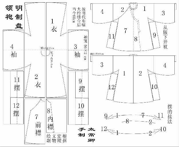 袖子的宽度(最宽处),明官服常服为一尺,公服以上叁尺(明一尺约34cm)。深衣(按朱子理解)齐腰,或指尺二尺二(黄梨洲理解),侈袂则叁尺叁(郑玄注)。出土文物来开,明中晚期制朝服75cm,蟒袍一般33cm、50cm、60cm,最宽86cm。
