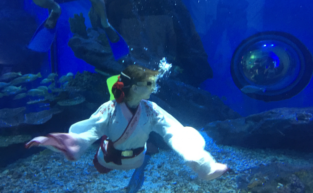 云鬓轻挽,裙裾飘飞,在蔚蓝大海中,身着汉服的饲养工作人员首度下水与海底鱼群曼妙共舞……端午节期间,武汉海昌极地海洋公园为游客准备了汉文化演出、汉服饰体验、龙女送福、万鱼同贺端午等丰富多彩、极具海洋风情的端午活动;16日上午,数千名游客先睹为快。