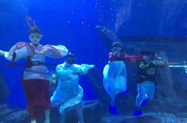当日,上午9点30分,饲养工作人员身着大家眼中的“古装”扮相,在蔚蓝海底翩翩起舞,在水中进行一系列的汉服、汉礼展示;本次展示的服装中有曲裾、大氅、齐胸襦裙、圆领袍等不同朝代的代表性服饰,完美展现汉服文化的延伸和发展,蔚蓝海水下灵动飘逸的汉服,在瑰丽鱼群的围绕下更为美轮美奂。