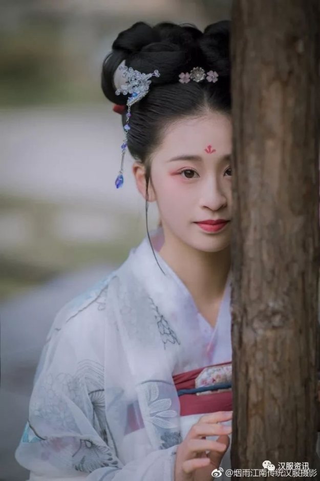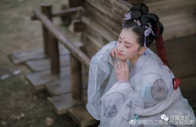 秦汉时期曲裾袍是女服中最为常见的一种服式,这种服装通身紧窄、长可曳地,穿上后下?一般呈喇叭状,行不露足。汉代窄袖紧身的绕襟深衣,衣服几经转折,绕至臀部,然后用绸带系束,衣上还绘有精美华丽的纹样。衣袖有宽窄两式,袖口大多镶边。衣领部分通常用交领,领口很低,以便露出里衣。如穿几件衣服,每层领子必露于外,最多的达三层以上,现代称“三重衣”。