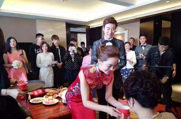 第一套是秀禾服,在家里穿的,等着新郎来接亲,新郎来了,要先用红包打开大门,再用红包打开新娘闺房的门,伴娘会出各种招数刁难考验新郎,最后新郎成功牵着穿着秀禾服的新娘走出闺房,给穿着西服和旗袍的岳父岳母敬茶,然后领着豪车队带新娘去婆家,一进门还是给穿着西服和旗袍的公婆敬茶,然后所有接亲的一起去吃饭。新娘开始换衣服。