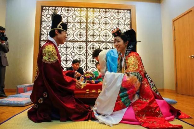 韩国的便传统风的婚礼也是这样啊,只不过似乎是在酒店婚礼后,家族中再举行传统仪式,然后蜜月旅行回来后再换上已婚女性的装束,穿几天意思一下。顺序可能不一样,但意思可以说是一样的: