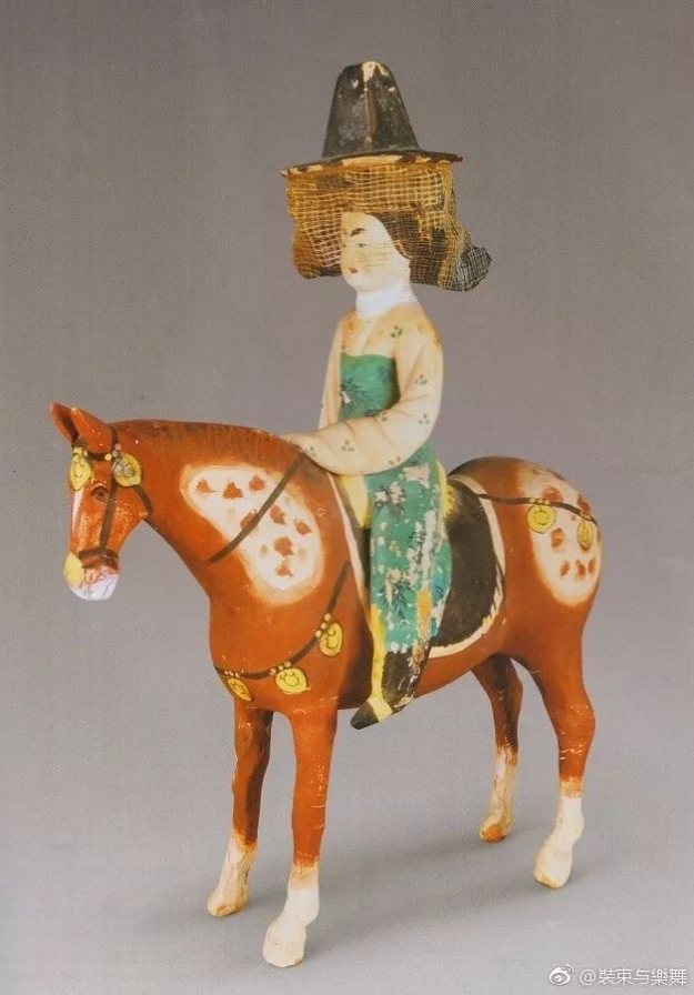 唐代彩绘骑马戴帷帽仕女俑。