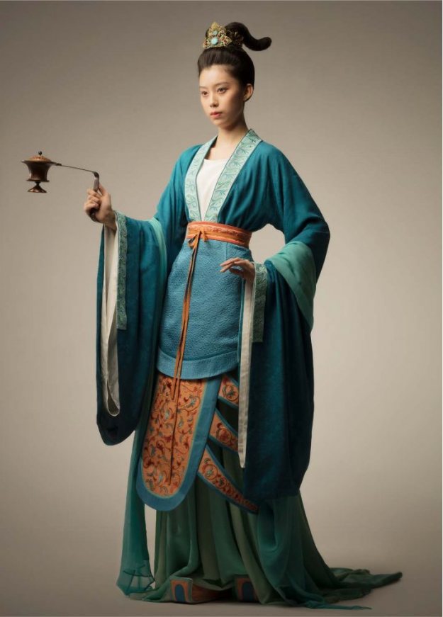 此次“敦煌服饰艺术再现”选择供养人画像为主要参考依据,是因为供养人作为出资或赞助敦煌洞窟开凿、佛教造像和壁画绘制的主体,其画像具有相对的写实性,至敦煌石窟晚期更发展成为壁画的主体内容之一。此款为西魏女供养人着装,对襟款式为汉服中常见之款式,更能体现汉服女子婉约不失典范之美。