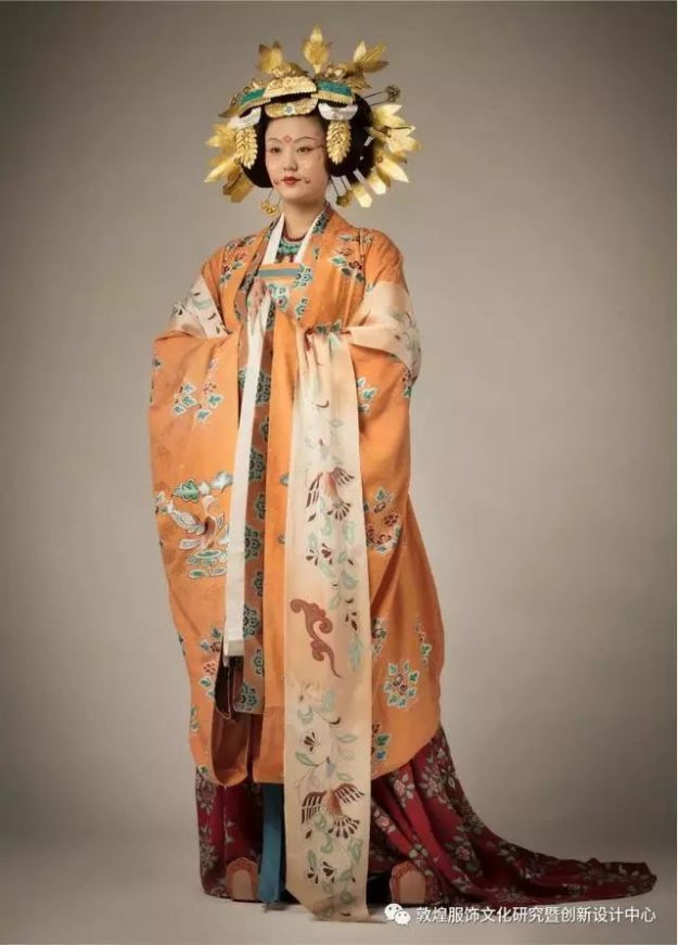 此款为莫高窟五代98窟东壁女供养人像服饰艺术再现,服制为唐制钿钗礼衣,主要色系为土黄,细节也是经得起推敲——敦煌之美,在衣袂翩跹的飞天上;敦煌之美,在梵乐莲步的舞步里;敦煌之美,在双手合十的微笑时,从东土到西域,从斑驳洞窥辉煌。
