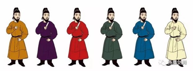 以不同颜色的袍服区分等级的“品色服”制度,大体形成于北周至隋之间,是当时随着胡式圆领袍在中国大规模推广同时形成的新概念。官员的服色大体自上而下为紫、绯、绿、青,历代略有调整,并一直沿用至明。这种色彩排列次序的成因有很多,更重要还与当时色彩染制获取的难易程度有关。