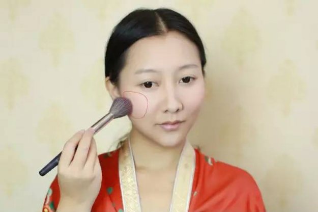 2.在选择区域内扫上腮红,我选择了橙色+桃红调出的颜色作为腮红色,可使整体妆面协调一些~