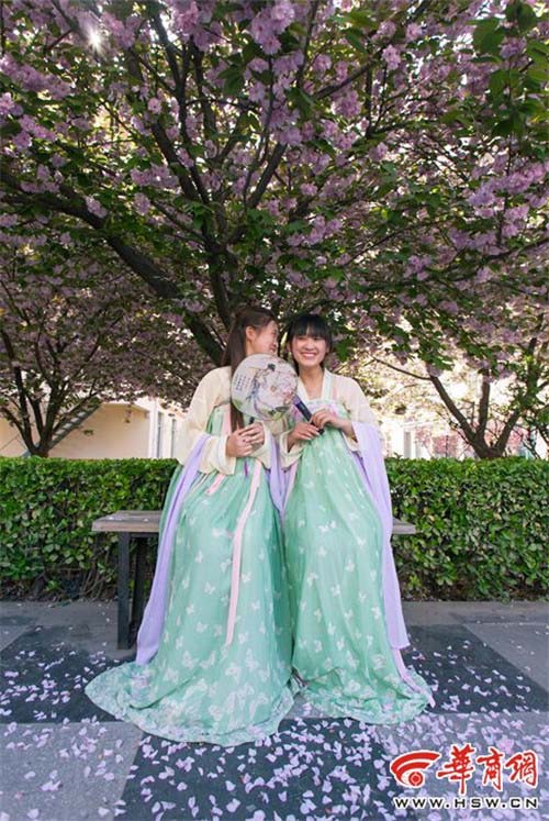 4月15日,正值樱花盛开期,西安思源学院20余名汉服爱好者身穿汉服、行万福礼在校园里玩起穿越,吸引众多学生围观。