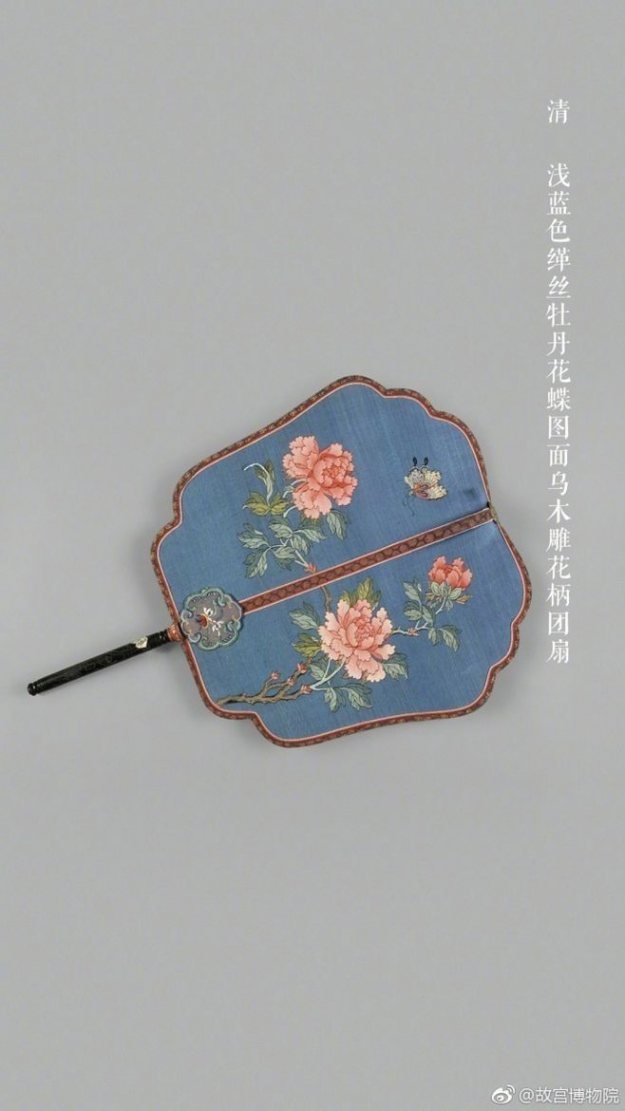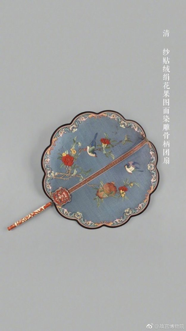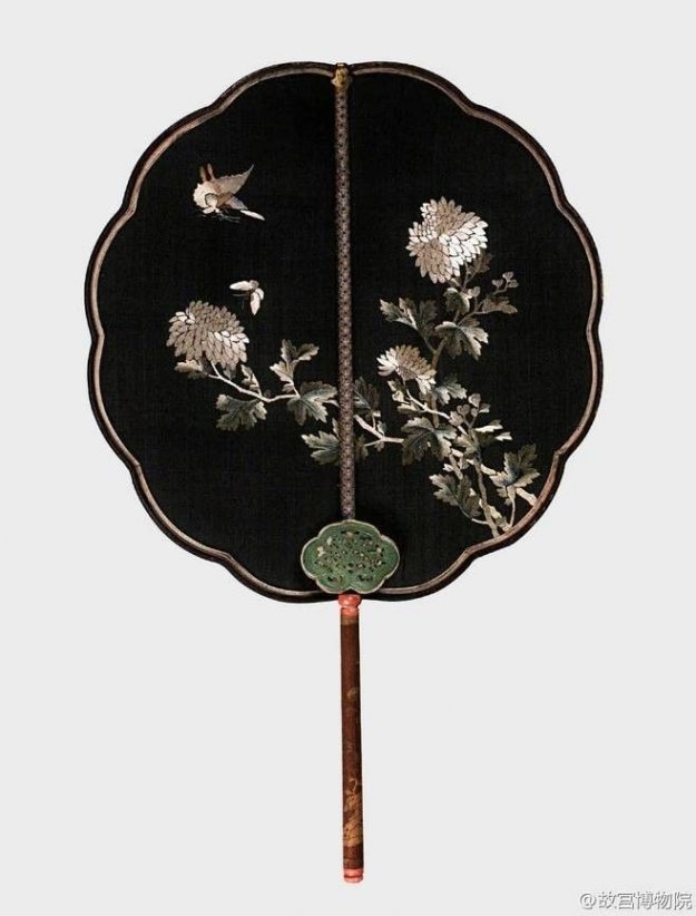 扇面上常绣以山水花卉,款式争奇斗艳,闺阁仕女手摇团扇,清风徐来,不但可以平添主人娴雅文静的仪态,又能体现女性天真活泼的个性。