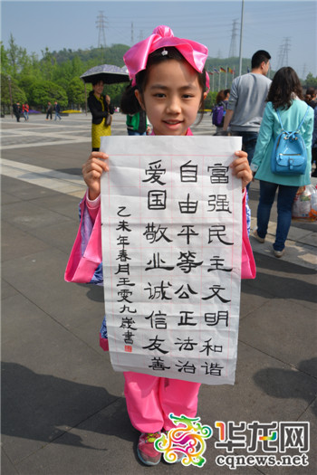 今(12)日上午,重庆园博园举行了一场名为“社会主义核心价值观”的儿童书法表演赛。来自墨香书画传习馆的30位小书法家参加了此次表演,他们身穿汉服进行书法创作,把传统与现代进行了一次完美的融合。