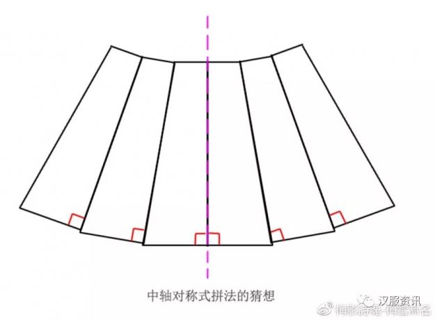 彭浩認為,此裙展開後如上圖,「腰部較窄(181釐米),下擺較寬(210.5釐米),通長82釐米。裙面由八片面料拼成,中間兩幅面料直裁,其餘各片均為斜裁。」[11]無劫緣則認為,此裙的下襬數據,均在26-27釐米附近,考慮到手工誤差,八片應該均為一個方式剪裁下的梯形,每片上22.6釐米、下26.3釐米,上下拼合,恰好大約是50釐米的幅寬。推測當是用布四幅,斜裁成為八片直角梯形。梯形的上下差距不大,整體裙子上下差僅29.5釐米,在大擺裙類中算是比較「窄」的裙子了,上身效果當形如筒裙。無劫緣推測,此時比較可能採用的是中軸對稱式拼法。這條裙子寬到181,接近能纏繞身體2圈,不知是墓主本身就胖到120的腰圍,還是這條裙子就應當圍兩圈,現今少數民族中的裙子便有需要一片式圍繞兩圈的,有可能與此相同。