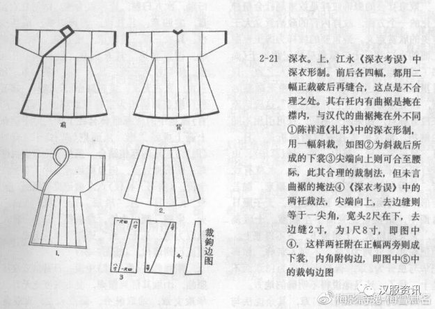 鞠衣下裳的交窬裁剪實物對應 黃能馥先生在《中國服飾史》中對於深衣也有同樣的主張,其云:「深衣……下裳用6幅,每幅又交解為二,共裁成12幅,以應每年有12個月的意涵。這12幅有的是對角斜裁的,裁片一頭寬、一頭窄,窄的一頭叫做『有殺』。」[10]是可知,黃能馥先生也是將交輸理解為為全幅布對角斜裁。