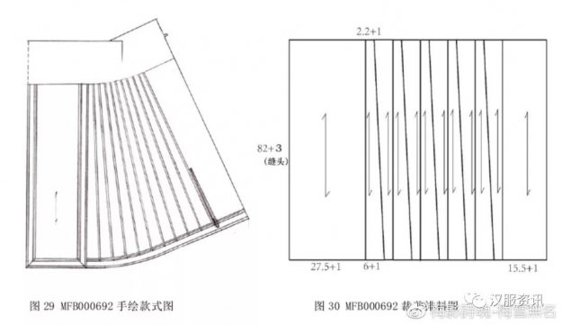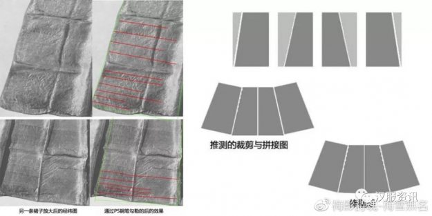 黃昇墓的拼接方式,線圖顯示為長方形拼接直角梯形,其實是由兩片長方形剪去一角,形成兩個接近長方形的五邊形,並在接合處收省,其作法接近時裝的一步裙。(具體數據與線圖因版權不能公布)