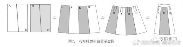 而在關於裙的剪裁記述中,「交窬」是理解其結構的關鍵。劉麗認為:「交窬」是一種裁法,在制裙、制襦、制袴時均被提及,「交窬」與《漢書.蒯伍江息夫傳》載:「充衣紗縠禪衣,曲裾後垂交輸」,中所言的「交輸」為同一含義,指斜裁。[3]彭浩表示,劉麗這一見解無疑是正確的。「交窬」釋義與裙的三種式樣「大衺」、「中衺」、「少衺」的「衺」字相對應,當指斜裁,即對形狀為矩形的全幅布料,沿縱向斜線剪切,產生直角梯形之狀。三種裙皆「交窬」,即採用斜裁方法完成裁片。以下為彭浩根據《秦簡.制衣》,所推測繪製的下裙剪裁與拼接圖[4]: