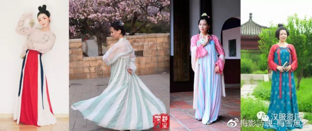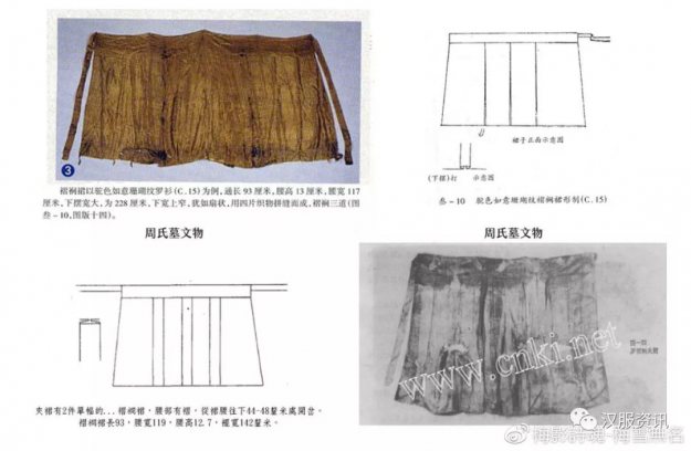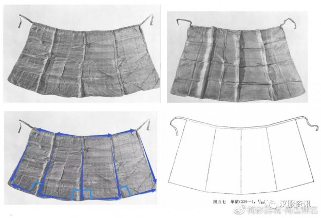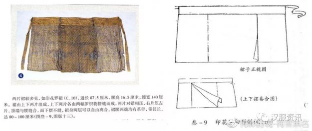 馬王堆出土的兩件裙子,身長均為87釐米,329-1號,腰寬145釐米,下襬193釐米,接腰寬3釐米。329-2號,腰寬143釐米,下擺158釐米,接腰寬2釐米。報告提到這兩件裙子:「形制相同,均用寬一幅的絹四片縫製而成。四片絹均為上窄下寬,居中的兩片寬度相同,稍窄;兩側兩片的寬度相同,稍寬。」[12]