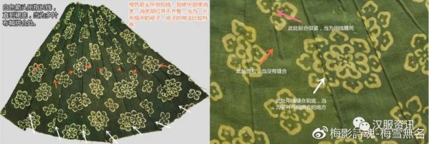 而周氏墓兩片裙,裙腰與下襬數據落差較大,是為大襬的兩片裙的,應為兩個直角梯形拼接而成。周氏墓的折枝朵花紋羅裙,於絲博展出,本派同袍小謝親自前往絲博觀察裙片拼接情況,察知裙子由四片上窄下寬的直角梯形裁片拼接而成。拼接方式為直角梯形的兩個斜角邊相拼形成一個裙片,然後腰端縫合為一條裙子。另一條周氏墓的兩片裙,2018年的國絲漢服節文物鑑賞活動時展出,筆者有幸與協同與會來賓一同鑑賞,發現此裙也是直角梯形拼接,並於上端收省。