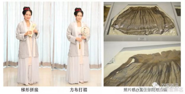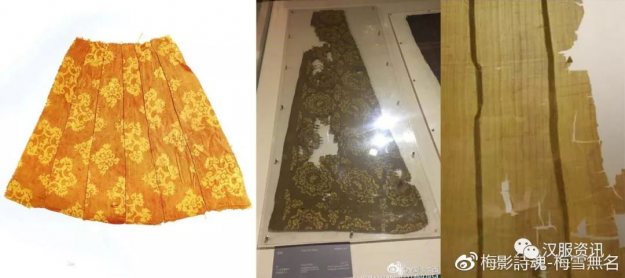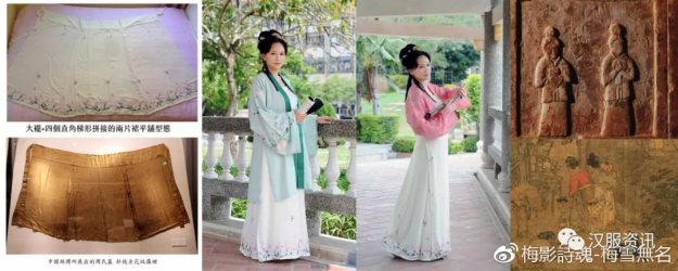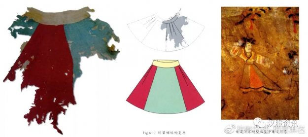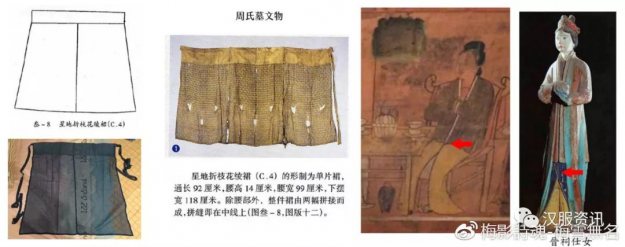 除了甯靖王夫人的鞠衣運用了交窬剪裁的。以下我們就出土實物,來看這種斜裁構成的,直角梯形拼接的裙子,有哪些出土實物?上身效果又是如何?