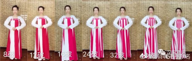 《舊唐書》記載:「其異色綾錦,並花間裙衣等,靡費既廣,俱害女工。天后,我之匹敵,常著『七破間裙』,豈不知更有靡麗服飾,務遵節儉也。」其中破字,高春明先生以為:「『破』或可釋為『剖』,所謂『七破』,就是指裙上被剖成七道,以間他色。又《新唐書.車服制》稱:『凡襇色衣不過十二破,渾色衣不過六破。』說的也是這種情況。整件裙子破數愈多,間色的布幅就愈窄,反之則闊。」[17]