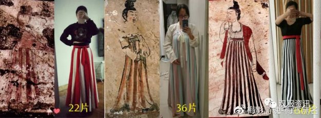 可知在兩漢魏晉時用整幅面料、通過打褶來調節腰擺圍度的裙式製作方式,是具有西域特徵的。豎間裁剪以及絹條裝飾則是偏中原的製作方式,西域早期流行的是橫間裙。自五胡亂華以降,胡服影響中原服飾,漢服女裙亦受其影響,在交窬裁剪的同時,也運用了打褶的方式製作,自唐代中葉即出現了三襇裙(或四襇裙)。
