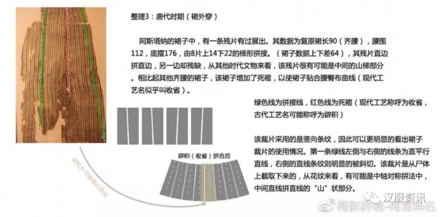 同袍孟瑜君提供了一張由同袍玲瓏拍攝的唐代絹裙殘片,應為吐魯番阿斯塔納出土,明顯可以看出是直角梯形的裙片構造。另一由維吾爾自治區博物館所藏的絹裙殘片,經緯明顯,可以看出一直一斜的情況。