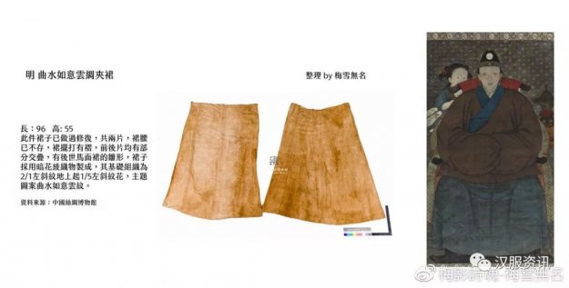 明代交窬裁剪運用最明確的證據,就是之前提到的寧靖王夫人鞠衣的下裳拼接。至於裙裝則無疑是馬面裙的天下,馬面裙褶多,如果沒有拆解,基本上無法判斷是否使用到直角梯形拼接。絲博所藏曲水如意雲綢夾裙,應是從宋代兩片裙演化到明代馬面裙的中途產物。扣除掉打褶部位,裙子裁片可以看見用運了直角梯形拼接方式。而這種兩片裙過渡到馬面裙的裙式,在容像中也有呈現。