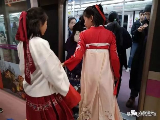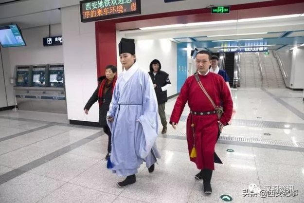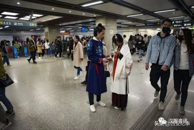 3月16日晚8点半,西安市地铁2号线钟楼站,两个身穿汉服的年轻人在众多乘客中显得与众不同