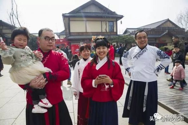 不过穿汉服也不是少年和姑娘的专利。今年2月5日正月初一,西安西咸新区沣东新城诗经里小镇,众多的游人当中,一家老少五口穿着汉服格外引人注目,服饰与周围建筑风格很是契合。这个家的“掌柜的”叫陈宣满,虽说他52岁年纪不算大,但孙女已经2岁多。他说因为儿媳去年加入一个汉服社团,然后就鼓动婆婆让一家人都穿上了汉服。