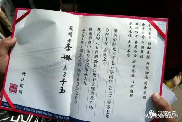 那时的成人礼上,每个冠礼的年轻人都获得一本证书。证书上每个人还都有一个表字,比如这位“李琳”同学表字“子玉”。除此之外,证书显示成人礼的日期在“公历二〇〇七年丁亥立夏之日”。如此算来,当年18岁行成年之礼的弱冠少年,如今已年过30岁。