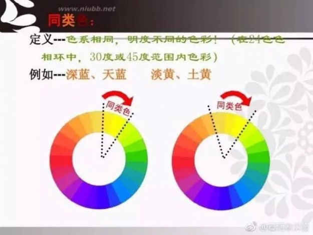 同类色:色相相同,颜色深浅不同,例如大红与粉红。