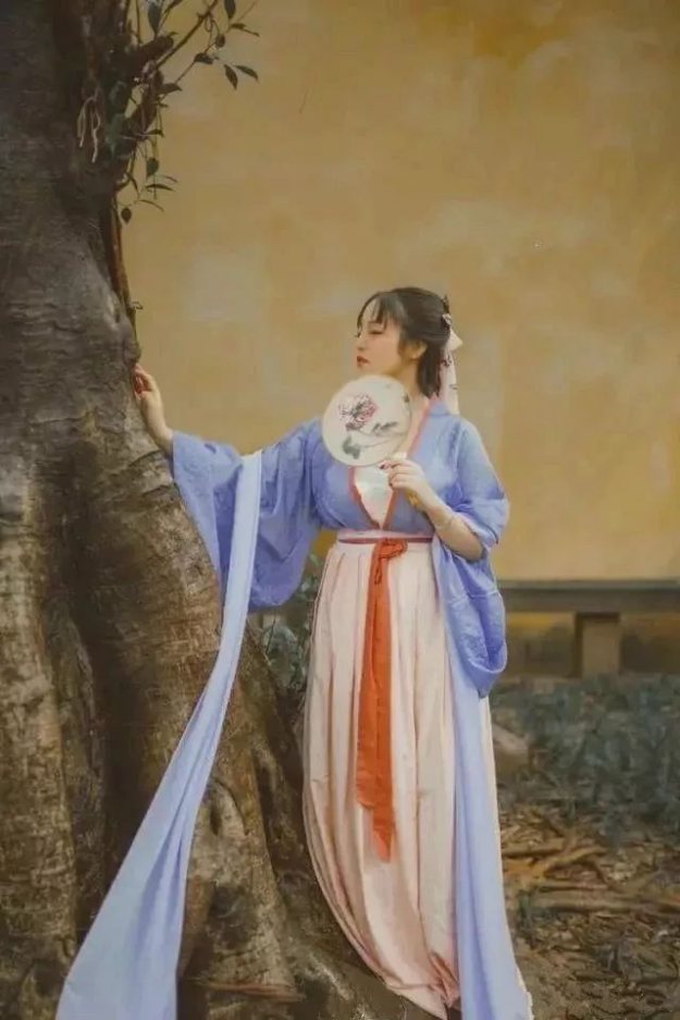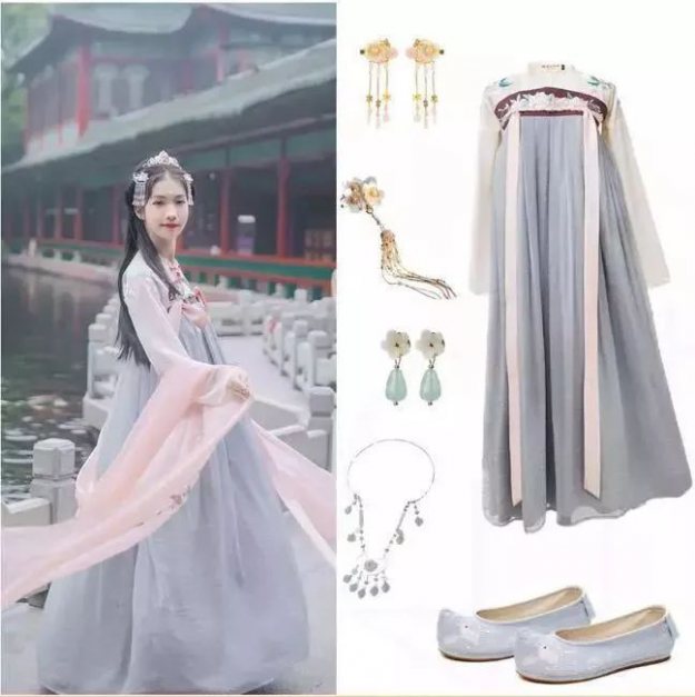 上襦蓝色,下裙紫色。给人一种渐变的感觉,十分协调。